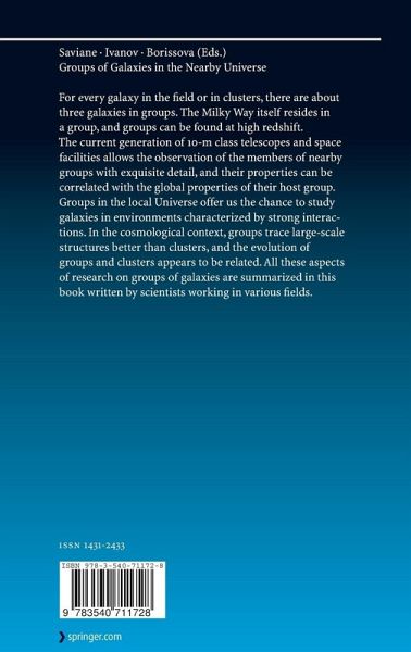 For every galaxy in the field or in clusters, there are about three galaxies in groups. The Milky Way itself resides in a group, and groups can be found at high redshift. The current generation of 10-m class telescopes and space facilities allows the observation of the members of nearby groups with exquisite detail, and their properties can be correlated with the global properties of their host group. Groups in the local Universe offer us the chance to study galaxies in environments characterized by strong interactions. In the cosmological context, groups trace large-scale structures better…mehr