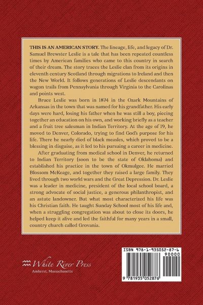 This is an American story. The lineage, life and legacy of Dr. Samuel Brewster Leslie is a tale that has been repeated countless times by American families who came to this country in search of their dream. The story traces the Leslie clan from its origins in 11th Century Scotland through migrations to Ireland and then the New World. It follows generations of Leslie descendants on wagon trails from Pennsylvania through Virginia to the Carolinas and points west. Bruce Leslie was born in 1874 in the Ozark Mountains of Arkansas in the town that was named for his grandfather. His early days were hard, losing his father when he was still a boy, piecing together an education on his own, and working briefly as a teacher and a fruit tree salesman in Indian Territory. At the age of 19, he moved to Denver, Colorado, trying to find God's purpose for his life. There he nearly died of black measles, which proved to be a blessing in disguise, as it led to his pursuing a career in medicine. After graduating from medical school in Denver, he returned to Indian Territory (soon to be the state of Oklahoma) and established his practice in the town of Okmulgee. He married Blossom McKeage, and together they raised a large family. They lived through two world wars and the Great Depression. Dr. Leslie was a leader in medicine, president of the local school board, a strong advocate of social justice, a generous philanthropist, and an astute landowner. But what most characterized his life was his Christian faith. He taught Sunday School most of his life and, when a struggling congregation was about to close its doors, he helped keep it alive and led the faithful for many years in a small, country church called Grovania.