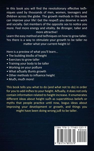 In this book you will find the revolutionary effective techniques used by thousands of men, women, teenagers and children across the globe. The growth methods in this book can improve your life! Get the respect you deserve in work and socially. Get members of the opposite sex to notice you more. Feel more energy and vitality. Be stronger, taller and more attractive! Learn the easy method and techniques on how to grow taller. Yes there is a way to stimulate your growth to be taller no matter what your current height is! Here is a preview of what you'll learn...The building blocks of height Exercises to grow taller Training your body to be taller Working on your posture What actually stunts growth Other methods to influence height Much, much more! This book tells you what to do (and what not to do) in order for you to add inches to your height. Actually, it does not only contain information related to height increase. It enumerates different ideas about height such as superstitious beliefs or myths that people practice until now, bogus ideas about improving your development or growth, and things you might have been doing wrong just to be taller.