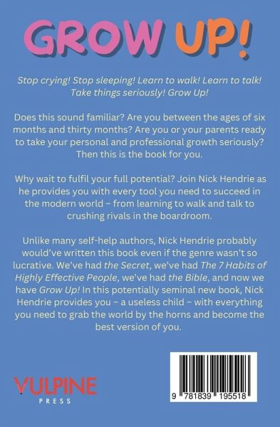 Are you ready to seize control of your life? Are you a baby or a toddler? Isn't it time for you to GROW UP? Stop crying! Stop sleeping! Learn to walk! Learn to talk! Take things seriously! Grow Up! Does this sound familiar? Are you between the ages of six months and thirty months? Are you or your parents ready to take your personal and professional growth seriously? Then this is the book for you. Why wait to fulfil your full potential? Join Nick Hendrie as he provides you with every tool you need to succeed in the modern world - from learning to walk and talk to crushing rivals in the boardroom. Unlike many self-help authors, Nick Hendrie probably would've written this book even if the genre wasn't so lucrative. We've had the Secret, we've had The 7 Habits of Highly Effective People, we've had the Bible, and now we have Grow Up! In this potentially seminal new book, Nick Hendrie provides you - a useless child - with everything you need to grab the world by the horns and become the best version of you.