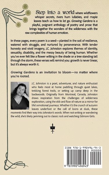 Step into a world where wildflowers whisper secrets, rivers hum lullabies, and maple leaves teach us how to let go. Growing Gardens is a playful, poignant anthology of poetry and prose that brings together the wonders of the wilderness with the raw complexities of human emotion. In these pages, every poem is a seed-planted in the soil of resilience, watered with struggle, and nurtured by perseverance. With tender honesty and vivid imagery, J.C. Johnston explores themes of identity, sexuality, disability, and the messy beauty of being human. Whether you've ever felt like a flower wilting in the shade or a tree standing tall through the storm, these verses will remind you: growth is never linear, but it's always worth it. Growing Gardens is an invitation to bloom-no matter where you're rooted. About the Author J.C. Johnston is a poet, adventurer, and nature enthusiast who feels most at home paddling through quiet lakes, trekking forest trails, or setting up camp deep in the backwoods. Originally from Montreal, Canada, Johnston draws inspiration from the challenges of wilderness exploration, using the ebb and flow of nature as a mirror for life's emotional journeys. Whether it's the crunch of autumn leaves underfoot or the call of loons at dusk, these moments find their way into Johnston's words. When not writing or wandering the wild, she's likely jamming out to classic rock and watching Gilmore Girls.