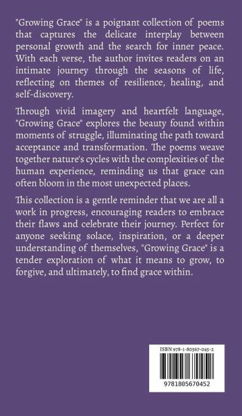 "Growing Grace" is a poignant collection of poems that captures the delicate interplay between personal growth and the search for inner peace. With each verse, the author invites readers on an intimate journey through the seasons of life, reflecting on themes of resilience, healing, and self-discovery. Through vivid imagery and heartfelt language, "Growing Grace" explores the beauty found within moments of struggle, illuminating the path toward acceptance and transformation. The poems weave together nature's cycles with the complexities of the human experience, reminding us that grace can often bloom in the most unexpected places. This collection is a gentle reminder that we are all a work in progress, encouraging readers to embrace their flaws and celebrate their journey. Perfect for anyone seeking solace, inspiration, or a deeper understanding of themselves, "Growing Grace" is a tender exploration of what it means to grow, to forgive, and ultimately, to find grace within.