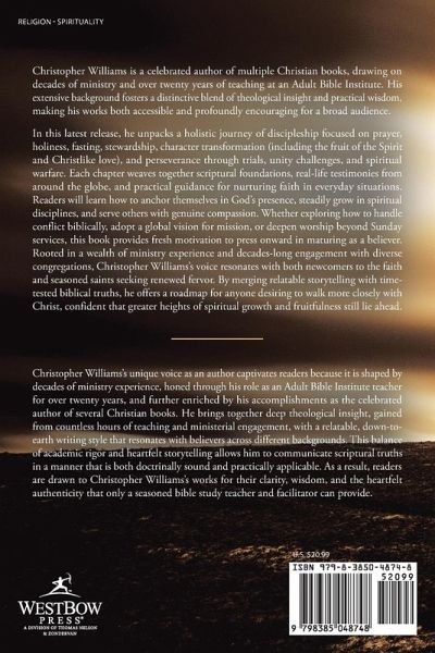 Christopher Williams is a celebrated author of multiple Christian books, drawing on decades of ministry and over twenty years of teaching at an Adult Bible Institute. His extensive background fosters a distinctive blend of theological insight and practical wisdom, making his works both accessible and profoundly encouraging for a broad audience. In this latest release, he unpacks a holistic journey of discipleship focused on prayer, holiness, fasting, stewardship, character transformation (including the fruit of the Spirit and Christlike love), and perseverance through trials, unity challenges, and spiritual warfare. Each chapter weaves together scriptural foundations, real-life testimonies from around the globe, and practical guidance for nurturing faith in everyday situations. Readers will learn how to anchor themselves in God's presence, steadily grow in spiritual disciplines, and serve others with genuine compassion. Whether exploring how to handle conflict biblically, adopt a global vision for mission, or deepen worship beyond Sunday services, this book provides fresh motivation to press onward in maturing as a believer. Rooted in a wealth of ministry experience and decades-long engagement with diverse congregations, Christopher Williams's voice resonates with both newcomers to the faith and seasoned saints seeking renewed fervor. By merging relatable storytelling with timetested biblical truths, he offers a roadmap for anyone desiring to walk more closely with Christ, confident that greater heights of spiritual growth and fruitfulness still lie ahead.