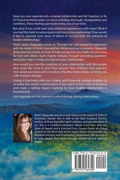 Have you ever experienced a strained relationship and felt hopeless to fix it? Fractured relationships can leave us feeling distraught, disappointed, and worthless. These feelings permeate every area of our lives. But what if you could view your relational experiences with hope? What if you had the tools to restore peace and joy in your relationship? How would it feel to separate your sense of failure or success from the outcome of broken relationships? That's where Nagasako comes in. Through her own powerful experience with the impact of God's love and her clinical work as a counselor, Nagasako gives practical, hands-on tools to help you grow in your faith and your love for God and others. Each chapter includes thought-provoking questions and action steps to help you improve your relationships. How would you rate the condition of your relationships with the people who mean the most to you? Your spouse? Your children? Your parents? How about your boss and co-workers? Healthy relationships can bring you a life of peace and joy! Living in harmony with our Creator and those He created enables us to make this world a better place. If you want to live a life of purpose and make a lasting impact, learning to have healthy relationships is foundational. Join Nagasako on her journey to unlock loving, lasting relationships.