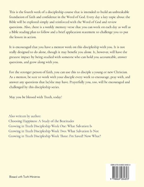 This is the fourth week of a discipleship course that is intended to build an unbreakable foundation of faith and confidence in the Word of God. Every day a key topic of the Bible will be explored simply and reinforced with the Word of God and review questions. Also, there is a weekly memory verse that you can work on each day as well as a Bible reading plan to follow and a brief application statement to challenge you to put the lesson in action. Days one through five of this week are a redistribution of Project One Generation discipleship by John Yates. It is encouraged that you have a mentor work on this discipleship with you. It is not really designed to do alone, though it may benefit you alone. It, however, will have the greatest impact by being studied with someone who can hold you accountable, answer questions, and grow along with you. For the stronger person of faith, you can use this to disciple a young or new Christian. As a mentor, be sure to work with your disciple every week to encourage, pray with, and answer any questions that he/she may have. Prayerfully you, too, will be encouraged and challenged by this discipleship series. May you be blessed with Truth, today!