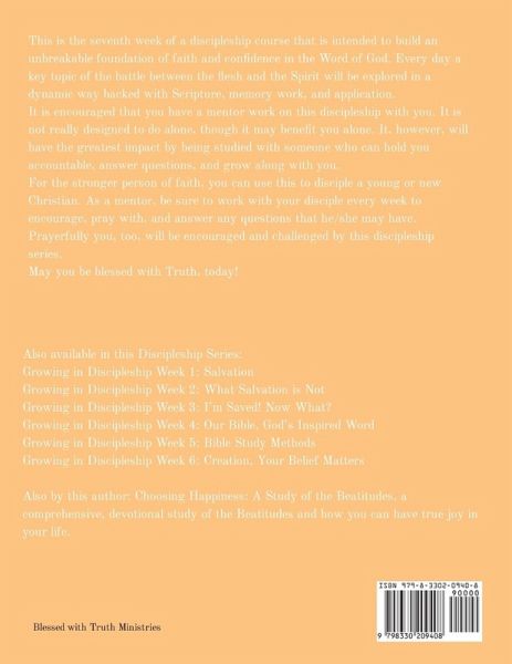 This is the seventh week of a discipleship course that is intended to build an unbreakable foundation of faith and confidence in the Word of God. Every day a key topic all about the battle of our sinful nature and our new holy nature which will be explored simply and reinforced with the Word of God and review questions. Also, there is a weekly memory verse that you can work on each day as well as a Bible reading plan to follow and a brief application statement to challenge you to put the lesson in action. It is encouraged that you have a mentor work on this discipleship with you. It is not really designed to do alone, though it may benefit you alone. It, however, will have the greatest impact by being studied with someone who can hold you accountable, answer questions, and grow along with you. For the stronger person of faith, you can use this to disciple a young or new Christian. As a mentor, be sure to work with your disciple every week to encourage, pray with, and answer any questions that he/she may have. Prayerfully you, too, will be encouraged and challenged by this discipleship series. May you be blessed with Truth, today!
