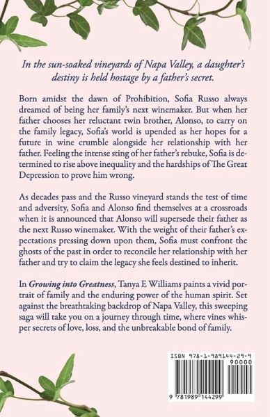 In the sun-soaked vineyards of Napa Valley, a daughter's destiny is held hostage by a father's secret. Born amidst the dawn of Prohibition, Sofia Russo always dreamed of being her family's next winemaker. But when her father chooses her reluctant twin brother, Alonso, to carry on the family legacy, Sofia's world is upended as her hopes for a future in wine crumble alongside the relationship with her father. Feeling the intense sting of her father's rebuke, Sofia is determined to rise above inequality and the hardships of The Great Depression to prove him wrong. As decades pass and the Russo vineyard stands the test of time and adversity, Sofia and Alonso find themselves at a crossroads when it is officially announced that Alonso will supersede their father as the next Russo winemaker. With the weight of their father's expectations pressing down upon them, Sofia must confront the ghosts of the past in order to reconcile her relationship with her father and try to claim the legacy she feels destined to inherit. In Growing into Greatness, Tanya E Williams paints a vivid portrait of family and the enduring power of the human spirit. Set against the breathtaking backdrop of Napa Valley, this sweeping saga will take you on a journey through time, where vines whisper secrets of love, loss, and the unbreakable bond of family.
