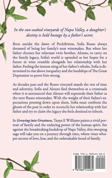 In the sun-soaked vineyards of Napa Valley, a daughter's destiny is held hostage by a father's secret. Born amidst the dawn of Prohibition, Sofia Russo always dreamed of being her family's next winemaker. But when her father chooses her reluctant twin brother, Alonso, to carry on the family legacy, Sofia's world is upended as her hopes for a future in wine crumble alongside the relationship with her father. Feeling the intense sting of her father's rebuke, Sofia is determined to rise above inequality and the hardships of The Great Depression to prove him wrong. As decades pass and the Russo vineyard stands the test of time and adversity, Sofia and Alonso find themselves at a crossroads when it is officially announced that Alonso will supersede their father as the next Russo winemaker. With the weight of their father's expectations pressing down upon them, Sofia must confront the ghosts of the past in order to reconcile her relationship with her father and try to claim the legacy she feels destined to inherit. In Growing into Greatness, Tanya E Williams paints a vivid portrait of family and the enduring power of the human spirit. Set against the breathtaking backdrop of Napa Valley, this sweeping saga will take you on a journey through time, where vines whisper secrets of love, loss, and the unbreakable bond of family.