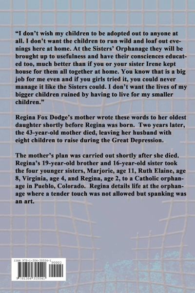 "I don't wish my children to be adopted out to anyone at all." Regina Fox Dodge's mother wrote these words to her oldest daughter shortly after Regina was born. Two years later, the 43-year-old mother died, leaving her husband with eight children to raise during the Great Depression. The mother's plan was carried out shortly after she died. Regina's 19-year-old brother and 16-year-old sister took the four younger sisters, Marjorie, age 11, Ruth Elaine, age 8, Virginia, age 4, and Regina, age 2, to a Catholic orphanage in Pueblo, Colorado. Regina details life at the orphanage where a tender touch was not allowed but spanking was an art.
