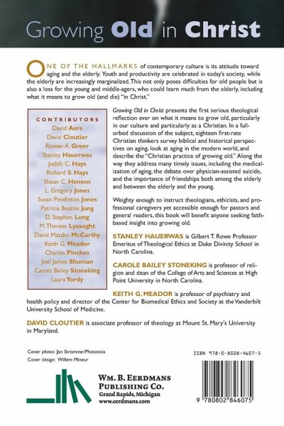 One of the hallmarks of contemporary culture is its attitude toward aging and the elderly. Youth and productivity are celebrated in today's society, while the elderly are increasingly marginalized. This not only poses difficulties for old people but is also a loss for the young and middle-agers, who could learn much from the elderly, including what it means to grow old (and die) "in Christ." Growing Old in Christ presents the first serious theological reflection ever on what it means to grow old, particularly in our culture and particularly as a Christian. In a full-orbed discussion of the subject, eighteen first-rate Christian thinkers survey biblical and historical perspectives on aging, look at aging in the modern world, and describe the "Christian practice of growing old." Along the way they address many timely issues, including the medicalization of aging, the debate over physician-assisted suicide, and the importance of friendships both among the elderly and between the elderly and the young. Weighty enough to instruct theologians, ethicists, and professional caregivers yet accessible enough for pastors and general readers, this book will benefit anyone seeking faith-based insight into growing old. Contributors: David Aers David Cloutier Rowan A. Greer Stanley Hauerwas Judith C. Hays Richard B. Hays Shaun C. Henson L. Gregory Jones Susan Pendleton Jones Patricia Beattie Jung D. Stephen Long M. Therese Lysaught David Matzko McCarthy Keith G. Meador Charles Pinches Joel James Shuman Carole Bailey Stoneking Laura Yordy