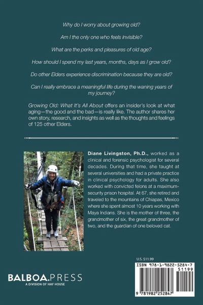 Why do I worry about growing old? Am I the only one who feels invisible? What are the perks and pleasures of old age? How should I spend my last years, months, days as I grow old? Do other Elders experience discrimination because they are old? Can I really embrace a meaningful life during the waning years of my journey? Growing Old: What It's All About offers an insider's look at what aging-the good and the bad-is really like. The author shares her own story, research, and insights as well as the thoughts and feelings of 125 other Elders.