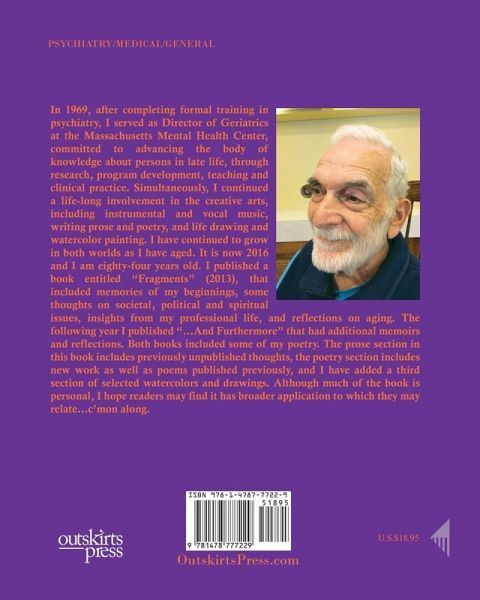In 1969, after completing formal training in psychiatry, I served as Director of Geriatrics at the Massachusetts Mental Health Center, committed to advancing the body of knowledge about persons in late life, through research, program development, teaching and clinical practice. Simultaneously, I continued a life-long involvement in the creative arts, including instrumental and vocal music, writing prose and poetry, and life drawing and watercolor painting. I have continued to grow in both worlds as I have aged. It is now 2016 and I am eighty-four years old. I published a book entitled "Fragments" (2013), that included memories of my beginnings, some thoughts on societal, political and spiritual issues, insights from my professional life, and reflections on aging. The following year I published "...And Furthermore" that had additional memoirs and reflections. Both books included some of my poetry. The prose section in this book includes previously unpublished thoughts, the poetry section includes new work as well as poems published previously, and I have added a third section of selected watercolors and drawings. Although much of the book is personal, I hope readers may find it has broader application to which they may relate...c'mon along.