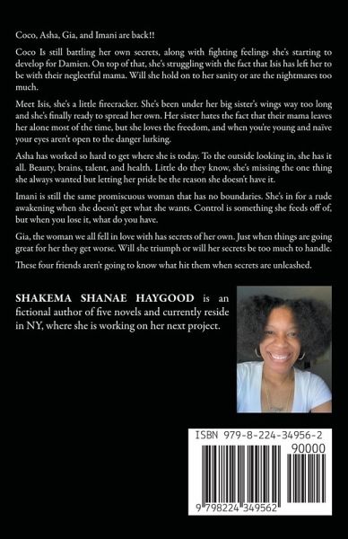 Coco, Asha, Gia, and Imani are back!! Coco Is still battling her own secrets, along with fighting feelings she's starting to develop for Damien. On top of that, she's struggling with the fact that Isis has left her to be with their neglectful mama. Will she hold on to her sanity or are the nightmares too much. Meet Isis, she's a little firecracker. She's been under her big sister's wings way too long and she's finally ready to spread her own. Her sister hates the fact that their mama leaves her alone most of the time, but she loves the freedom, and when you're young and naïve your eyes aren't open to the danger lurking. Asha has worked so hard to get where she is today. To the outside looking in, she has it all. Beauty, brains, talent, and health. Little do they know, she's missing the one thing she always wanted but letting her pride be the reason she doesn't have it. Imani is still the same promiscuous woman that has no boundaries. She's in for a rude awakening when she doesn't get what she wants. Control is something she feeds off of, but when you lose it, what do you have. Gia, the woman we all fell in love with has secrets of her own. Just when things are going great for her they get worse. Will she triumph or will her secrets be too much to handle. These four friends aren't going to know what hit them when secrets are unleashed.