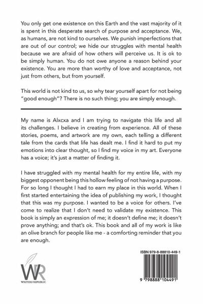 My name is Alxcxa and I am trying to navigate this life and all its challenges. I believe in creating from experience. All of these stories, poems, and artwork are my own, each telling a different tale from the cards that life has dealt me. I find it hard to put my emotions into clear thought, so I find my voice in my art. Everyone has a voice; it's just a matter of finding it.I have struggled with my mental health for my entire life, with my biggest opponent being this hollow feeling of not having a purpose. For so long I thought I had to earn my place in this world. When I first started entertaining the idea of publishing my work, I thought that this was my purpose. I wanted to be a voice for others. I've come to realize that I don't need to validate my existence. This book is simply an expression of me; it doesn't define me; it doesn't prove anything; and that's ok. This book and all of my work is like an olive branch for people like me - a comforting reminder that you are enough.