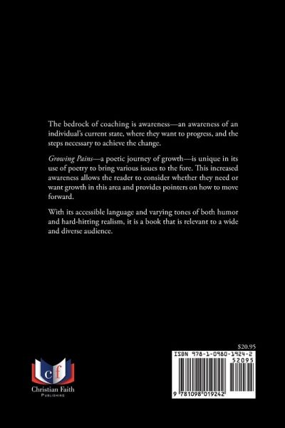 The bedrock of coaching is awareness-an awareness of an individual's current state, where they want to progress, and the steps necessary to achieve the change. Growing Pains-a poetic journey of growth-is unique in its use of poetry to bring various issues to the fore. This increased awareness allows the reader to consider whether they need or want growth in this area and provides pointers on how to move forward. With its accessible language and varying tones of both humor and hard-hitting realism, it is a book that is relevant to a wide and diverse audience.