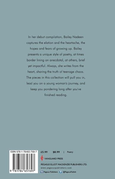 In her debut compilation, Bailey Nadeen captures the elation and the heartache, the hopes and fears of growing up. Bailey presents a unique style of poetry, at times border lining on anecdotal, at others, brief yet impactful. Always, she writes from the heart, sharing the truth of teenage chaos. The pieces in this collection will pull you in, lead you on a young woman's journey, and keep you pondering long after you've finished reading.