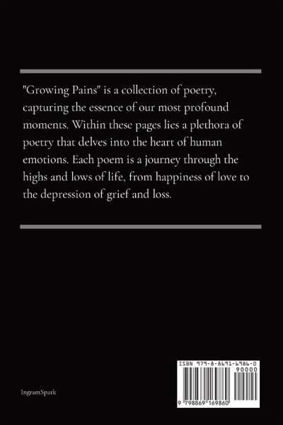 "Growing Pains" is a collection of poetry, capturing the essence of our most profound moments. Within these pages lies a plethora of poetry that delves into the heart of human emotions. Each poem is a journey through the highs and lows of life, from happiness of love to the depression of grief and loss.
