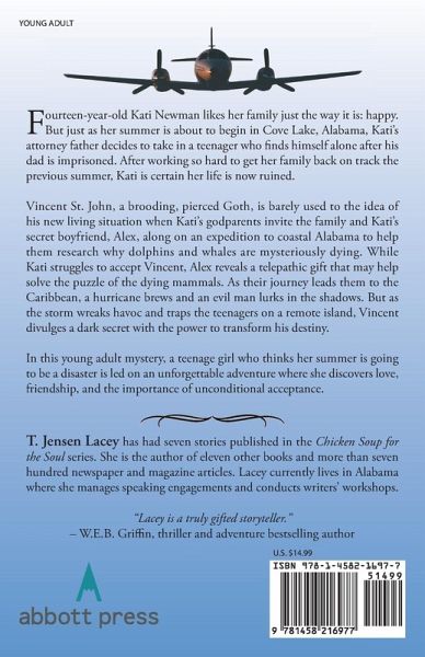 Fourteen-year-old Kati Newman likes her family just the way it is: happy. But just as her summer is about to begin in Cove Lake, Alabama, Kati?s attorney father decides to take in a teenager who finds himself alone after his dad is imprisoned. After working so hard to get her family back on track the previous summer, Kati is certain her life is now ruined. Vincent St. John, a brooding, pierced Goth, is barely used to the idea of his new living situation when Kati?s godparents invite the family and Kati?s secret boyfriend, Alex, along on an expedition to coastal Alabama to help them research why dolphins and whales are mysteriously dying. While Kati struggles to accept Vincent, Alex reveals a telepathic gift that may help solve the puzzle of the dying mammals. As their journey leads them to the Caribbean, a hurricane brews and an evil man lurks in the shadows. But as the storm wreaks havoc and traps the teenagers on a remote island, Vincent divulges a dark secret with the power to transform his destiny. In this young adult mystery, a teenage girl who thinks her summer is going to be a disaster is led on an unforgettable adventure where she discovers love, friendship, and the importance of unconditional acceptance.