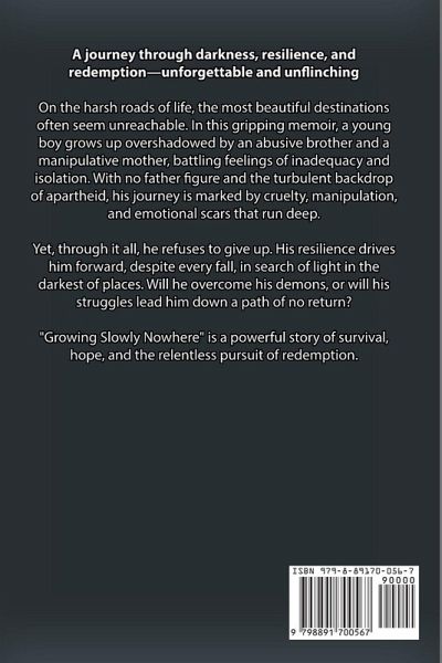 Sometimes, the hardest roads lead to the most beautiful destinations. This gripping memoir, filled with raw emotion and unflinching honesty, delves deep into the harrowing experiences of a young boy overshadowed by an older sibling. In this powerful narrative, he must navigate the toxic dynamics of a narcissistic mother and a psychopathic brother, constantly struggling with feelings of inadequacy and isolation. As the second-born, he carries the heavy burden of living in the shadow of the favored first-born. With no father figure to guide him, he is left vulnerable to manipulation, cruelty, and abuse. The scars, both physical and emotional, run deep. The author fearlessly shares his story, unveiling the darkest corners of his past, including the unspeakable horrors of sexual, verbal, and emotional abuse. Set against the backdrop of the apartheid era, a time of rampant discrimination and inequality, the author's personal struggles intertwine with the intense social unrest. He must confront dire obstacles without a moral compass to guide him. Repeatedly hitting rock bottom, he refuses to surrender to the darkness that threatens to consume him. With unwavering determination, he musters the courage to rise again, battling against adversities that seem insurmountable. Will he ultimately overcome his demons and finding redemption? Or will his choices lead him down a path of self-destruction? Join him on a journey through endless roads that seem to lead nowhere, as he yearns for a place to call home. Through his dejected voice, you will experience the echo of his pain and resilience. This unforgettable true-life story will captivate your heart and leave a lasting impact. Brace yourself for a rollercoaster of emotions, as the power of his haunting tale resonates with you long after you turn the last page.