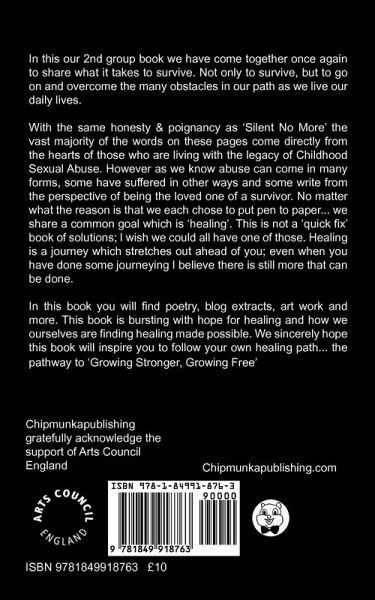 In this our 2nd group book we have come together once again to share what it takes to survive. Not only to survive, but to go on and overcome the many obstacles in our path as we live our daily lives. With the same honesty & poignancy as 'Silent No More' the vast majority of the words on these pages come directly from the hearts of those who are living with the legacy of Childhood Sexual Abuse. However as we know abuse can come in many forms, some have suffered in other ways and some write from the perspective of being the loved one of a survivor. No matter what the reason is that we each chose to put pen to paper... we share a common goal which is 'healing'. This is not a 'quick fix' book of solutions; I wish we could all have one of those. Healing is a journey which stretches out ahead of you; even when you have done some journeying I believe there is still more that can be done. In this book you will find poetry, blog extracts, art work and more. This book is bursting with hope for healing and how we ourselves are finding healing made possible. We sincerely hope this book will inspire you to follow your own healing path... the pathway to 'Growing Stronger, Growing Free'