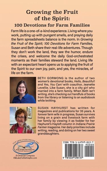 Farm life is a one-of-a-kind experience. Living where you work, putting up with pungent smells, and praying daily the farm spreadsheets balance is the norm. In Growing the Fruit of the Spirit: 100 Devotions for Farm Families, Susan and Beth share their real-life adventures. Though they don't work the land, they see the humor, endure the crises, and welcome the daily God-orchestrated moments as their families steward the land. Living life with an expectant heart opens us to applying the fruit of the Spirit to our own joy, pain, and yes, the miracles, of life on the farm.