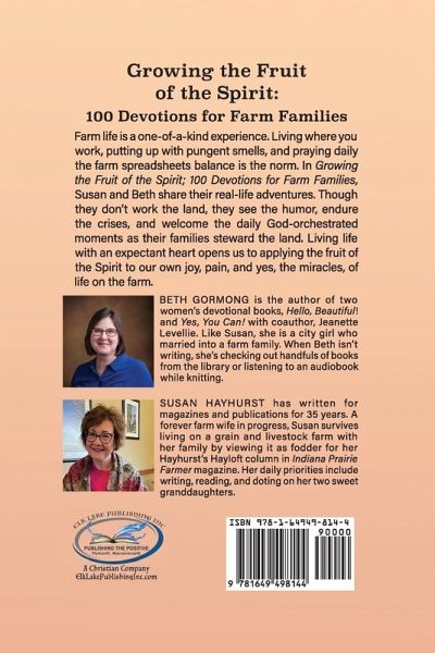 Farm life is a one-of-a-kind experience. Living where you work, putting up with pungent smells, and praying daily the farm spreadsheets balance is the norm. In Growing the Fruit of the Spirit: 100 Devotions for Farm Families, Susan and Beth share their real-life adventures. Though they don't work the land, they see the humor, endure the crises, and welcome the daily God-orchestrated moments as their families steward the land. Living life with an expectant heart opens us to applying the fruit of the Spirit to our own joy, pain, and yes, the miracles, of life on the farm.