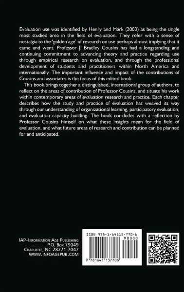 Evaluation use was identified by Henry and Mark (2003) as being the single most studied area in the field of evaluation. They refer with a sense of nostalgia to the 'golden age' of research on use perhaps almost implying that it came and went. Professor J. Bradley Cousins has had a longstanding and continuing commitment to advancing theory and practice regarding use through empirical research on evaluation, and through the professional development of students and practitioners within North America and internationally. The important influence and impact of the contributions of Cousins and associates is the focus of this edited book. This book brings together a distinguished, international group of authors, to reflect on the areas of contribution of Professor Cousins, and situate his work within contemporary areas of evaluation research and practice. Each chapter describes how the study and practice of evaluation has weaved its way through our understanding of organizational learning, participatory evaluation, and evaluation capacity building. The book concludes with a reflection by Professor Cousins himself on what these insights mean for the field of evaluation, and what future areas of research and contribution can be planned for and anticipated.