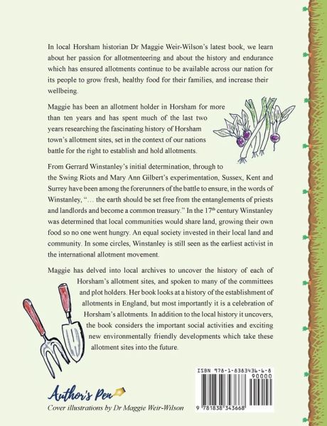 In local Horsham historian Dr Maggie Weir-Wilson's latest book, we learn about her passion for allotmenteering and about the history and endurance which has ensured allotments continue to be available across our nation for its people to grow fresh, healthy food for their families, and increase their wellbeing. Maggie has been an allotment holder in Horsham for more than ten years and has spent much of the last two years researching the fascinating history of Horsham town's allotment sites, set in the context of our nations battle for the right to establish and hold allotments. From Gerrard Winstanley's initial determination, through to the Swing Riots and Mary Ann Gilbert's experimentation, Sussex, Kent and Surrey have been among the forerunners of the battle to ensure, in the words of Winstanley, "... the earth should be set free from the entanglements of priests and landlords and become a common treasury." In the 17th century Winstanley was determined that local communities would share land, growing their own food so no one went hungry. An equal society invested in their local land and community. In some circles, Winstanley is still seen as the earliest activist in the international allotment movement. Maggie has delved into local archives to uncover the history of each of Horsham's allotment sites, and spoken to many of the committees and plot holders. Her book looks at a history of the establishment of allotments in England, but most importantly it is a celebration of Horsham's allotments. In addition to the local history it uncovers, the book considers the important social activities and exciting new environmentally friendly developments which take these allotment sites into the future.