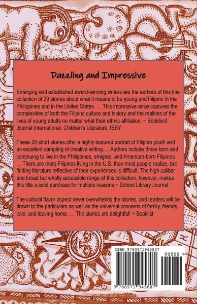 Growing Up Filipinos: Stories for Young Adults is the acclaimed collection of stories about the experience of growing up Filipino. Emerging and established award-winning writers are the authors of this fine collection of 29 short stories about what it means to be young and Filipino in the Philippines and the United States. Filipinos in America are the second largest in the umbrella group of Asian Americans, yet there is a scarcity of books by and for Filipinos. This impressive array captures the complexities of both the culture and history and the realities of the lives of young adults no matter what their ethnic affiliation. Each story is assigned to one of five universal themes: family, angst, friendship, love, and home. Each story is introduced by a thumbnail sketch of the author and a paragraph or two about some element of Filipino culture or history that is relevant to the story. Authors include those born and continuing to live in the Philippines, emigres, and American-born Filipinos. The book was in the National Geographic Summer Reading List for 2020; it was a finalist for the 2005 National Book Award, Philippines.