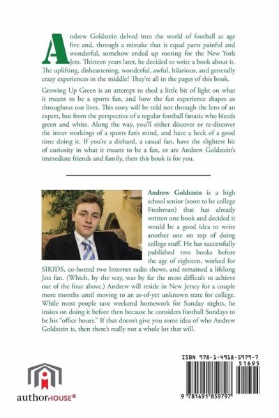 Andrew Goldstein delved into the world of football at age five and, through a mistake that is equal parts painful and wonderful, somehow ended up rooting for the New York Jets. Thirteen years later, he decided to write a book about it. The uplifting, disheartening, wonderful, awful, hilarious, and generally crazy experiences in the middle? They're all in the pages of this book. Growing Up Green is an attempt to shed a little bit of light on what it means to be a sports fan, and how the fan experience shapes us throughout our lives. This story will be told not through the lens of an expert, but from the perspective of a regular football fanatic who bleeds green and white. Along the way, you'll either discover or re-discover the inner workings of a sports fan's mind, and have a heck of a good time doing it. If you're a diehard, a casual fan, have the slightest bit of curiosity in what it means to be a fan, or are Andrew Goldstein's immediate friends and family, then this book is for you.