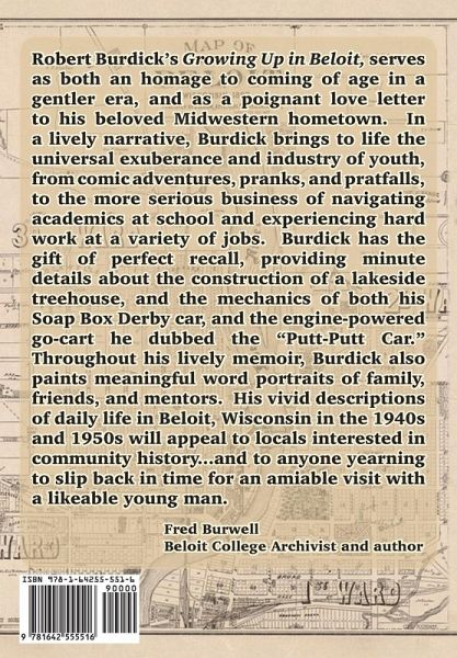 Robert Burdick’s Growing Up in Beloit, serves as both an homage to coming of age in a gentler era, and as a poignant love letter to his beloved Midwestern hometown. In a lively narrative, Burdick brings to life the universal exuberance and industry of youth, from comic adventures, pranks, and pratfalls, to the more serious business of navigating academics at school and experiencing hard work at a variety of jobs. Burdick has the gift of perfect recall, providing minute details about the construction of a lakeside treehouse, and the mechanics of both his Soap Box Derby car, and the engine-powered go-cart he dubbed the "Putt-Putt Car." Throughout his lively memoir, Burdick also paints meaningful word portraits of family, friends, and mentors. His vivid descriptions of daily life in Beloit, Wisconsin in the 1940s and 1950s will appeal to locals interested in community history...and to anyone yearning to slip back in time for an amiable visit with a likeable young man. Fred Burwell Beloit College Archivist and author