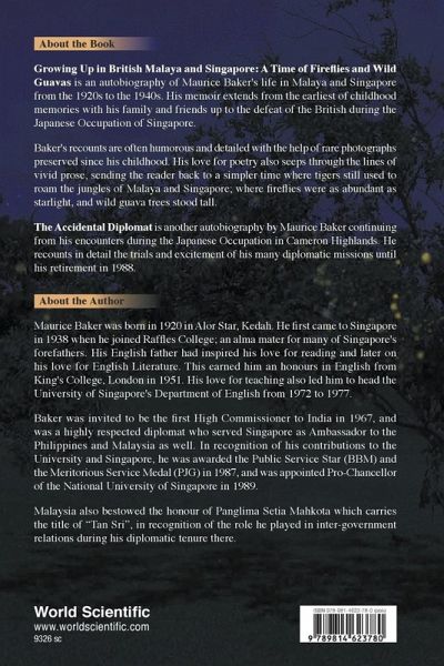 Growing Up in British Malaya and Singapore: A Time of Fireflies and Wild Guavas is an autobiography of Maurice Baker's life in Malaya and Singapore from the 1920s to the 1940s. His memoir extends from the earliest of childhood memories with his family and friends up to the defeat of the British during the Japanese Occupation of Singapore. Baker's recounts are often humorous and detailed with the help of rare photographs, preserved since his childhood. His love for poetry also seeps through the lines of vivid prose, sending the reader back to a simpler time where tigers still used to roam the jungles of Malaya and Singapore; where fireflies were as abundant as starlight, and wild guava trees stood tall.
