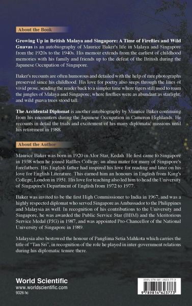 Growing Up in British Malaya and Singapore: A Time of Fireflies and Wild Guavas is an autobiography of Maurice Baker's life in Malaya and Singapore from the 1920s to the 1940s. His memoir extends from the earliest of childhood memories with his family and friends up to the defeat of the British during the Japanese Occupation of Singapore. Baker's recounts are often humorous and detailed with the help of rare photographs, preserved since his childhood. His love for poetry also seeps through the lines of vivid prose, sending the reader back to a simpler time where tigers still used to roam the jungles of Malaya and Singapore; where fireflies were as abundant as starlight, and wild guava trees stood tall.