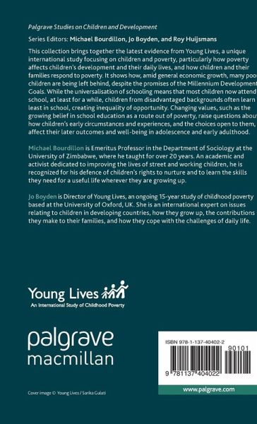 Introduction: Child Poverty and the Centrality of Schooling; Michael Bourdillon and Jo Boyden PART I: POVERTY AND THE LIVES OF GROWING CHILDREN 1. How Does Where Children Live Affect How They Develop? Evidence from Communities in Ethiopia and Vietnam; Paul Dornan and María José Ogando Portela 2. Family Socio-economic Status, Mother's Psychosocial Skills and Children's Human Capital: Evidence from Four Low- and Middle-Income Countries; Andreas Georgiadis and Priscila Hermida 3. 'I Am Dependent On My Children's Support': Risk and Protective Factors for Children Experiencing Adverse Events; María José Ogando Portela and Kirrily Pells 4. Gender, Agency and Poverty: Children's Everyday Experiences in Andhra Pradesh and Vietnam; Gina Crivello, Vu Thi Thanh Huong and Uma Vennam PART II: HOW DOES SCHOOLING HELP THE POOR? 5. Schooling and Cognitive Outcomes from Childhood to Youth: A Longitudinal Analysis; Caine Rolleston and Zoe James 6. Changes in Rural Children's Use of Time: Evidence from Ethiopia and Andhra Pradesh, India; Virginia Morrow, Yisak Tafere, and Uma Vennam 7. The Role of Formal Education in the Subjective Well-being of Young Teenagers in Rural and Urban Peru; Alexandra Cussianovich and Vanessa Rojas 8. Fulfilling the Promise of School Education? Factors Shaping Education Inequalities in Ethiopia, India, Peru and Vietnam; Helen Murray 9. How Much Difference Does School Make and For Whom? A Two-Country Study of the Impact of School Quality on Educational Attainment; Sofya Krutikova, Caine Rolleston and Elisabetta Aurino 10. Ethnic Minority Children's and Adults' Perceptions and Experiences of Schooling in Vietnam: A Case Study of the Cham H'roi; Vu Thi Thanh Huong 11. Educational Opportunities and Learning Outcomes of Children in Peru: A Longitudinal Model; Santiago Cueto, Juan León, and Ismael G. Muñoz 12. Reflections: Inequality, School and Social Change; Michael Bourdillon and Jo Boyden