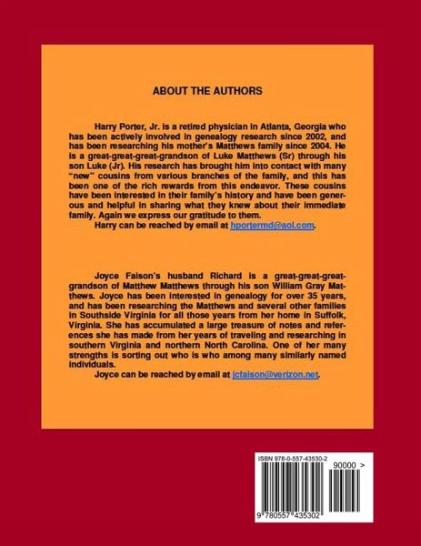 A history of the Matthews family, descendants of John and Lucretia Matthews of Eighteenth Century Brunswick County, Virginia, tracing eight generations of their descendants.