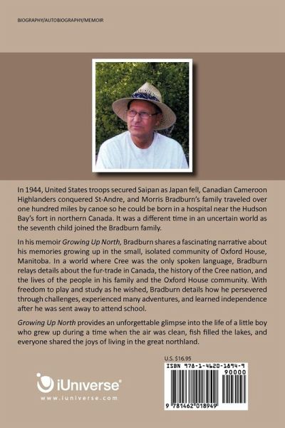 In 1944, United States troops secured Saipan as Japan fell, Canadian Cameroon Highlanders conquered St-Andre, and Morris Bradburn's family traveled over one hundred miles by canoe so he could be born in a hospital near the Hudson Bay's fort in northern Canada. It was a different time in an uncertain world as the seventh child joined the Bradburn family. In his memoir Growing Up North, Bradburn shares a fascinating narrative about his memories growing up in the small, isolated community of Oxford House, Manitoba. In a world where Cree was the only spoken language, Bradburn relays details about the fur trade in Canada, the history of the Cree nation, and the lives of the people in his family and the Oxford House community. With freedom to play and study as he wished, Bradburn details how he persevered through challenges, experienced many adventures, and learned independence after he was sent away to attend school. Growing Up North provides an unforgettable glimpse into the life of a little boy who grew up during a time when the air was clean, fish filled the lakes, and everyone shared the joys of living in the great northland.