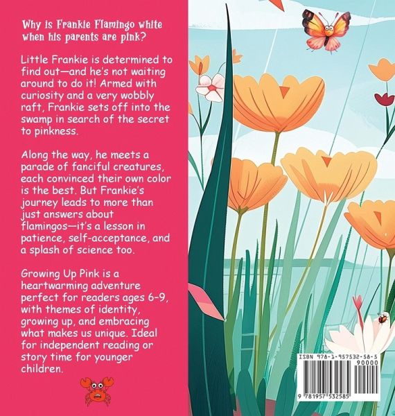Why is Frankie Flamingo white when all the other flamingos are pink? He's not waiting around to find out-he's off on a big adventure! In Growing Up Pink, a heartwarming and hilarious children's picture book for ages 6-9, young readers follow the curious and determined Frankie Flamingo as he paddles into the mangrove swamp in search of the secret to becoming pink. Along the way, Frankie meets a variety of colorful animals-from a proud blue heron to a sleepy white opossum-each with their own opinion on what color is best. This beautifully illustrated, read-aloud friendly story teaches important lessons about patience, self-acceptance, and even a little science behind flamingo feathers! With lovable characters, gentle humor, and a positive message, Growing Up Pink is a perfect choice for: Early readers in grades 1-3 Bedtime stories and classroom read-alouds Parents and teachers looking for diverse animal books with positive values Fans of nature-themed picture books and animal adventures Whether you're raising a reader who loves birds, science, or just a great story, Growing Up Pink will have them smiling, learning, and maybe even asking for seconds at dinner-because as Frankie learns, being pink takes patience... and supper!