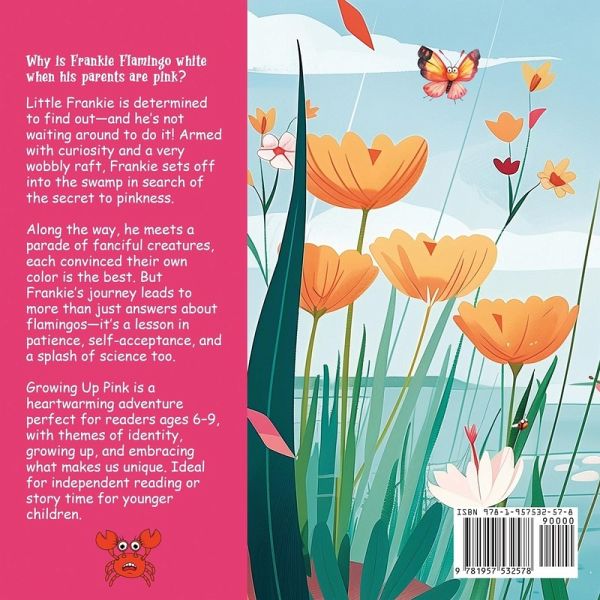 Why is Frankie Flamingo white when all the other flamingos are pink? He's not waiting around to find out-he's off on a big adventure! In Growing Up Pink, a heartwarming and hilarious children's picture book for ages 6-9, young readers follow the curious and determined Frankie Flamingo as he paddles into the mangrove swamp in search of the secret to becoming pink. Along the way, Frankie meets a variety of colorful animals-from a proud blue heron to a sleepy white opossum-each with their own opinion on what color is best. This beautifully illustrated, read-aloud friendly story teaches important lessons about patience, self-acceptance, and even a little science behind flamingo feathers! With lovable characters, gentle humor, and a positive message, Growing Up Pink is a perfect choice for: Early readers in grades 1-3 Bedtime stories and classroom read-alouds Parents and teachers looking for diverse animal books with positive values Fans of nature-themed picture books and animal adventures Whether you're raising a reader who loves birds, science, or just a great story, Growing Up Pink will have them smiling, learning, and maybe even asking for seconds at dinner-because as Frankie learns, being pink takes patience... and supper!