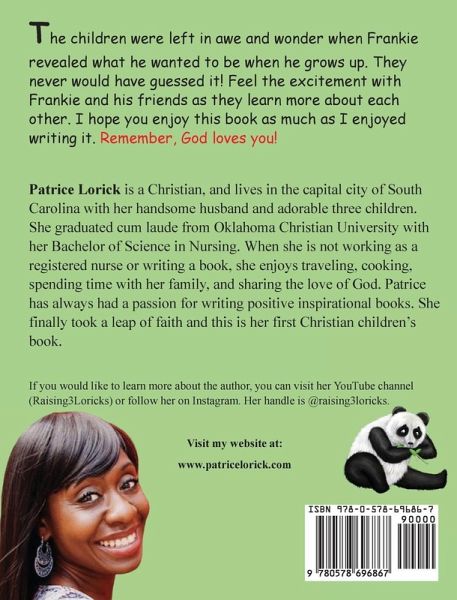 The children were left in awe and wonder when Frankie revealed what he wanted to be when he grows up. They never would have guessed it! Feel the excitement with Frankie and his friends as they learn more about each other. I hope you enjoy this book as much as I enjoyed writing it. Remember, God loves you! Growing Up With Frankie is a delightful Christian children's book that is jammed packed with humor, fun, surprises, and vibrant colors! Although this book is geared towards children, there is also a wonderful lesson in this book for the adult reading it. This is a good read for any time of the day, especially bedtime! This book will teach children about: 1. The Love of Jesus 2. Cool Occupations 3. Friendship Fall in love with Frankie and his friends!