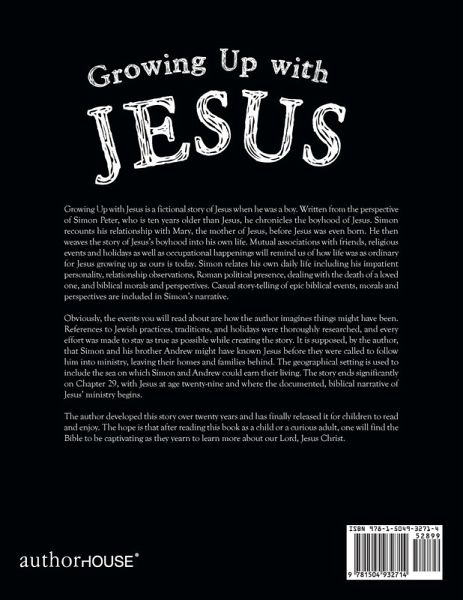 Growing Up with Jesus is a fictional story of Jesus when he was a boy. Written from the perspective of Simon Peter, who is ten years older than Jesus, he chronicles the boyhood of Jesus. Simon recounts his relationship with Mary, the mother of Jesus, before Jesus was even born. He then weaves the story of Jesus's boyhood into his own life. Mutual associations with friends, religious events and holidays as well as occupational happenings will remind us of how life was as ordinary for Jesus growing up as ours is today. Simon relates his own daily life including his impatient personality, relationship observations, Roman political presence, dealing with the death of a loved one, and biblical morals and perspectives. Casual story-telling of epic biblical events, morals and perspectives are included in Simon's narrative. Obviously, the events you will read about are how the author imagines things might have been. References to Jewish practices, traditions, and holidays were thoroughly researched, and every effort was made to stay as true as possible while creating the story. It is supposed, by the author, that Simon and his brother Andrew might have known Jesus before they were called to follow him into ministry, leaving their homes and families behind. The geographical setting is used to include the sea on which Simon and Andrew could earn their living. The story ends significantly on Chapter 29, with Jesus at age twenty-nine and where the documented, biblical narrative of Jesus' ministry begins. The author developed this story over twenty years and has finally released it for children to read and enjoy. The hope is that after reading this book as a child or a curious adult, one will find the Bible to be captivating as they yearn to learn more about our Lord, Jesus Christ.