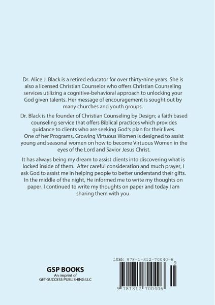 Dr. Alice J. Black is a retired educator for over thirty-nine years. She is also a licensed Christian Counselor who offers Christian Counseling services utilizing a cognitive-behavioral approach to unlocking your God given talents. Her message of encouragement is sought out by many churches and youth groups. Dr. Black is the founder of Christian Counseling by Design; a faith based counseling service that offers Biblical practices which provides guidance to clients who are seeking God's plan for their lives. One of her Programs, Growing Virtuous Women is designed to assist young and seasonal women on how to become Virtuous Women in the eyes of the Lord and Savior Jesus Christ.