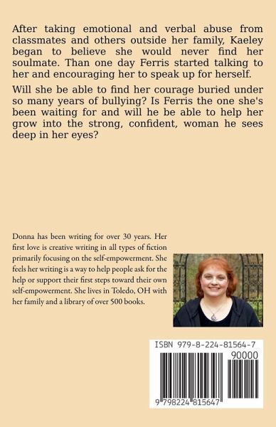 After taking emotional and verbal abuse from classmates and others outside her family, Kaeley began to believe she would never find her soulmate. Than one day Ferris started talking to her and encouraging her to speak up for herself. Will she be able to find her courage buried under so many years of bullying? Is Ferris the one she's been waiting for and will he be able to help her grow into the strong, confident, woman he sees deep in her eyes?