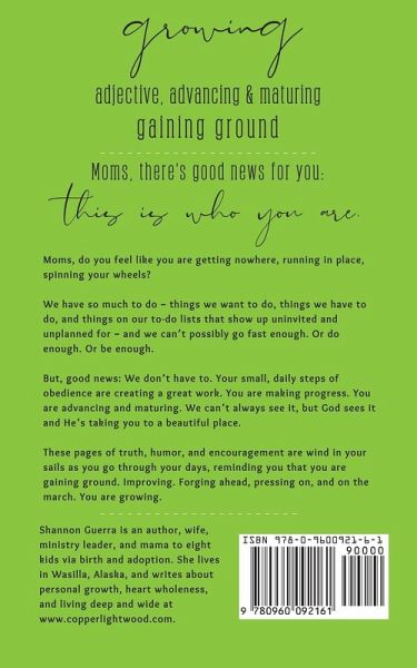 Moms, do you feel like you are getting nowhere, running in place, spinning your wheels? We have so much to do - things we want to do, things we have to do, and things on our to-do lists that show up uninvited and unplanned for - and we can't possibly go fast enough. Or do enough. Or be enough. But, good news: We don't have to. Your small, daily steps of obedience are creating a great work. You are making progress. You are advancing and maturing. We can't always see it, but God sees it and He's taking you to a beautiful place. These 60 pages of truth, humor, and encouragement are wind in your sails as you go through your days, reminding you that you are gaining ground. Improving. Forging ahead, pressing on, and on the march. You are growing.
