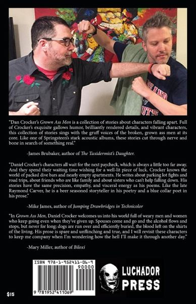 "Dan Crocker's Grown Ass Men is a collection of stories about characters falling apart. Full of Crocker's exquisite gallows humor, brilliantly rendered details, and vibrant characters, this collection of stories sings with the gruff voices of the broken, grown ass men at its core. Like one of Springsteen's stark acoustic albums, these stories cut through nerve and bone in search of something real." -James Brubaker, author of The Taxidermist's Daughter. "Daniel Crocker's characters all wait for the next paycheck, which is always a little too far away. And they spend their waiting time wishing for a well-lit piece of luck. Crocker knows the world of packed dive bars and nearly empty apartments. He writes about parking lot fights and road trips, about friends who are like family and about sisters who can't help falling down. His stories have the same precision, empathy, and visceral energy as his poems. Like the late Raymond Carver, he is a beer seasoned storyteller in his poetry and a blue collar poet in his prose." -Mike James, author of Jumping Drawbridges in Technicolor "In Grown Ass Men, Daniel Crocker welcomes us into his world full of weary men and women who keep going even when they've given up. Spouses come and go and the alcohol flows and stops, but never for long; dogs are run over and efficiently buried, the blood left on the shirts of the living. His prose is spare and unflinching and true, and I will revisit these characters to keep me company when I'm wondering how the hell I'll make it through another day." -Mary Miller, author of Biloxi