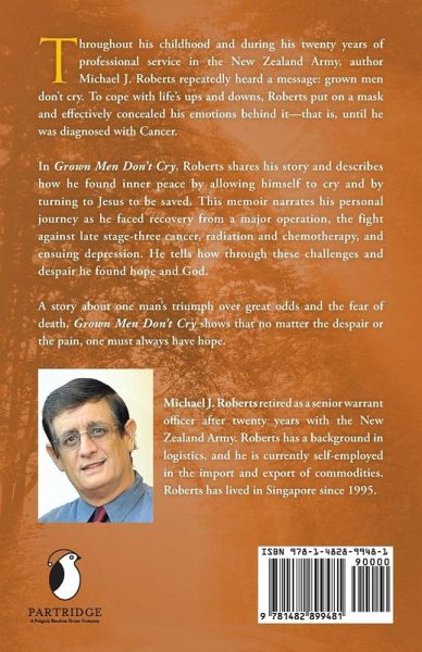Throughout his childhood and during his twenty years of professional service in the New Zealand Army, author Michael J. Roberts repeatedly heard a message: grown men don't cry. To cope with life's ups and downs, Roberts put on a mask and effectively concealed his emotions behind it-that is, until he was diagnosed with cancer. In Grown Men Don't Cry, Roberts shares his story and describes how he found inner peace by allowing himself to cry and by turning to be Jesus to be saved. This memoir narrates his personal journey as he faced recovery from a major operation, the fight against late stage-three cancer, radiation, and chemotherapy and ensuing depression. He tells how through these challenges and despair he found hope and God. A story about one man's triumph over great odds and the fear of death, Grown Men Don't Cry shows that no matter the despair or the pain, one must always have hope.