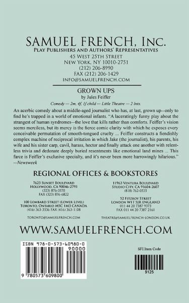 Comedy / 2m, 4f, 1f child / 2 Ints. An acerbic comedy by the famed cartoonist and author of KNOCK KNOCK and LITTLE MURDERS. It's about a middle-aged journalist who has, at last, grown up - only to find he's trapped in a world of emotional infants. "A laceratingly funny play about the strangest of human syndromes - the love that kills rather than comforts. Feiffer's vision seems merciless, but its mercy is the fierce comic clarity with which he exposes every conceivable permutation of smooth-ton
