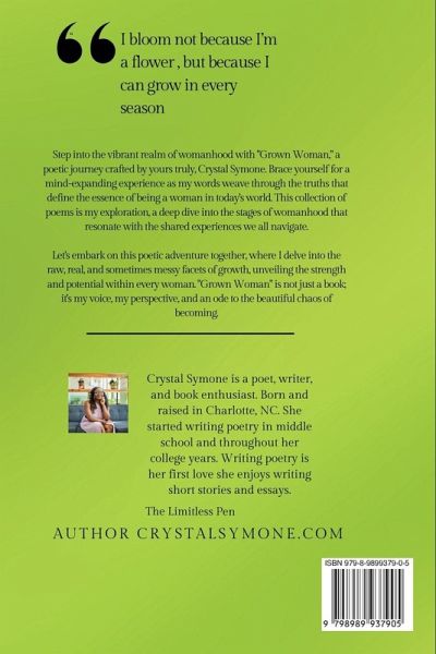 Step into the vibrant realm of womanhood with "Grown Woman," a poetic journey crafted by yours truly, Crystal Symone. Brace yourself for a mind-expanding experience as my words weave through the truths that define the essence of being a woman in today's world. This collection of poems is my exploration, a deep dive into the stages of womanhood that resonate with the shared experiences we all navigate. Let's embark on this poetic adventure together, where I delve into the raw, real, and sometimes messy facets of growth, unveiling the strength and potential within every woman. "Grown Woman" is not just a book; it's my voice, my perspective, and an ode to the beautiful chaos of becoming.