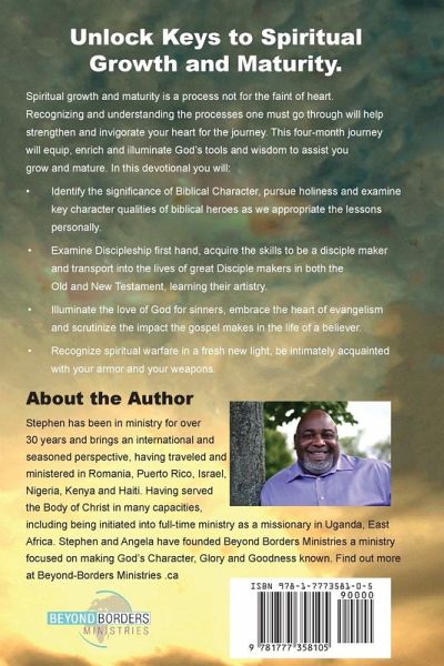 Spiritual growth and maturity is a process not for the faint of heart. Recognizing and understanding the processes one must go through will help strengthen and invigorate your heart for the journey. This four-month journey will equip, enrich and illuminate God's tools and wisdom to assist you grow and mature. In this devotional you will: Identify the significance of Biblical Character, pursue holiness and examine key character qualities of biblical heroes as we appropriate the lessons personally. Examine Discipleship first hand, acquire the skills to be a disciple maker and transport into the lives of great Disciple makers in both the Old and New Testament, learning their artistry. Illuminate the love of God for sinners, embrace the heart of evangelism and scrutinize the impact the gospel makes in the life of a believer. Recognize spiritual warfare in a fresh new light, be intimately acquainted with your armor and your weapons.