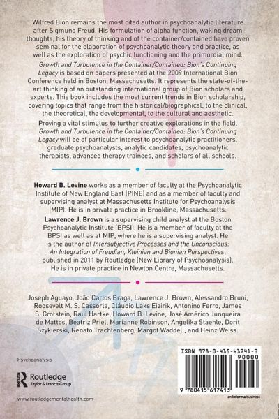 Levine Brown Introduction and Historical Overview. Laks Eizerik Introduction. Brown The Development of Bion's Concept of Container and Contained. Szykierski The Traumatic Roots Of The Containment Fruit: The Evolution Of Bion's Metapsychological Questions From Bearing Witness To Dreadful Answers. Aguayo Wilfred Bion's 'Caesura': From Public Lecture to Published Text-(1975-1977). Clinical Process. Ferro Vicissitudes Of The Container-Contained And Field Theory. Grotstein Dreaming As A "Curtain Of Illusion": Revisiting The "Royal Road" With Bion As Our Guide. Hartke Psychological Turbulence In The Analytic Situation. Cassorla Reflections On Non-Dreams-For-Two Enactment And The Analyst's Implicit Alpha-Function. Pathological States. Junqueira de Mattos & Braga Primitive Conscience: A Glimpse Of The Primordial Mind. Bruni Container-Contained. Inverted Relationship. Weiss Romantic Perversion - a Pathological Organization Based on -L. Reflections on Containment and the Experience of Time. Trachtenberg Caesura Denial and Envy. Infant and Child Analysis. Robinson Infant Observation: Catastrophic Change Under a Microscope. Staehle The Threatening Character of Change. An Approach With Patients Who Experience Progress As Trauma. Applied Studies. Waddell Meaning And Form. The Containing Function Of Art. Priel The Power of Form: The Shoah in Contemporary Hebrew Literature. Final Thoughts. Levine Looking Back Looking Ahead.