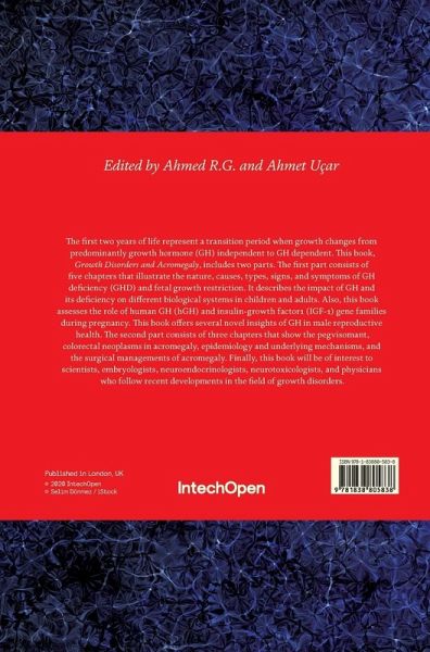 The first two years of life represent a transition period when growth changes from predominantly growth hormone (GH) independent to GH dependent. This book, Growth Disorders and Acromegaly, includes two parts. The first part consists of five chapters that illustrate the nature, causes, types, signs, and symptoms of GH deficiency (GHD) and fetal growth restriction. It describes the impact of GH and its deficiency on different biological systems in children and adults. Also, this book assesses the role of human GH (hGH) and insulin-growth factor1 (IGF-1) gene families during pregnancy. This book offers several novel insights of GH in male reproductive health. The second part consists of three chapters that show the pegvisomant, colorectal neoplasms in acromegaly, epidemiology and underlying mechanisms, and the surgical managements of acromegaly. Finally, this book will be of interest to scientists, embryologists, neuroendocrinologists, neurotoxicologists, and physicians who follow recent developments in the field of growth disorders.